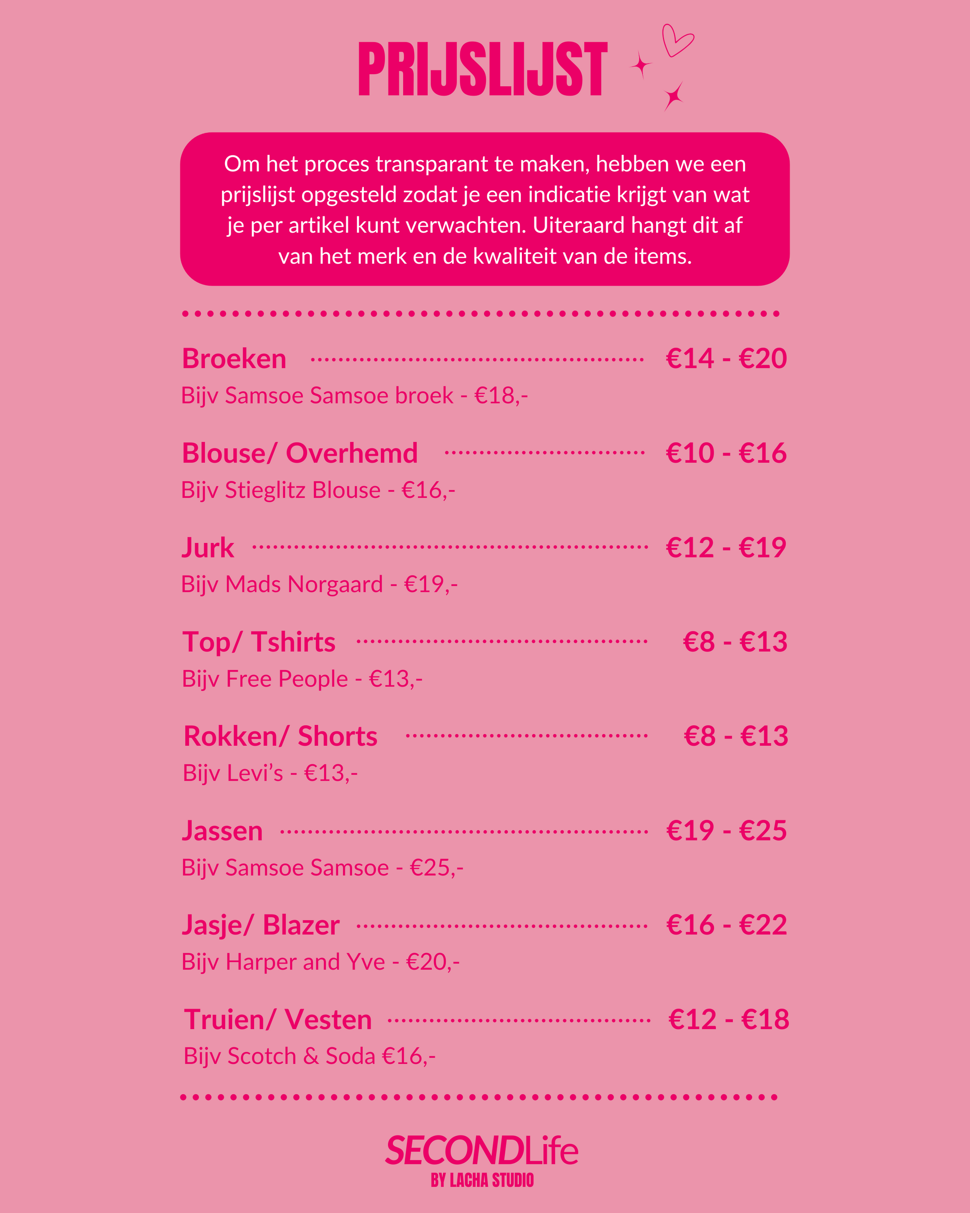 LACHA STUDIO stelt de nieuwe verkoopprijs van de items vast, rekening houdend met de staat, het merk en de marktomstandigheden.